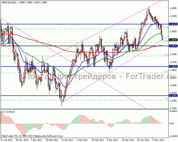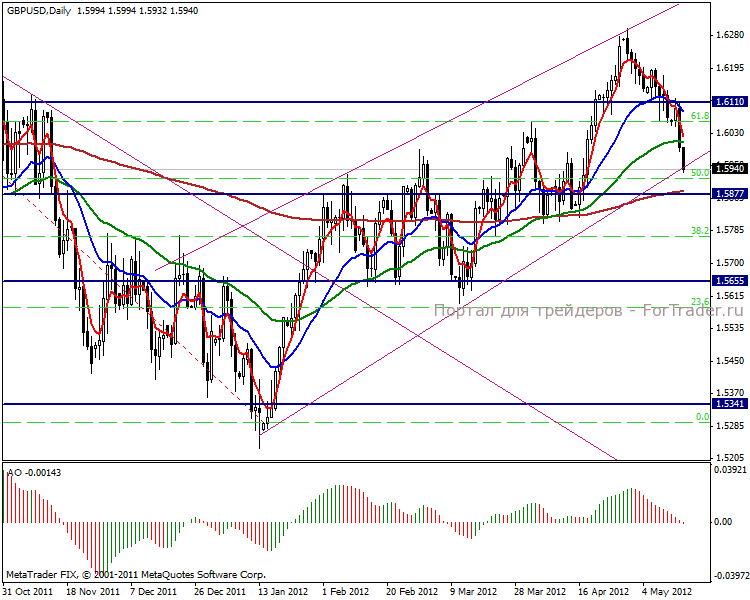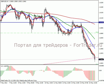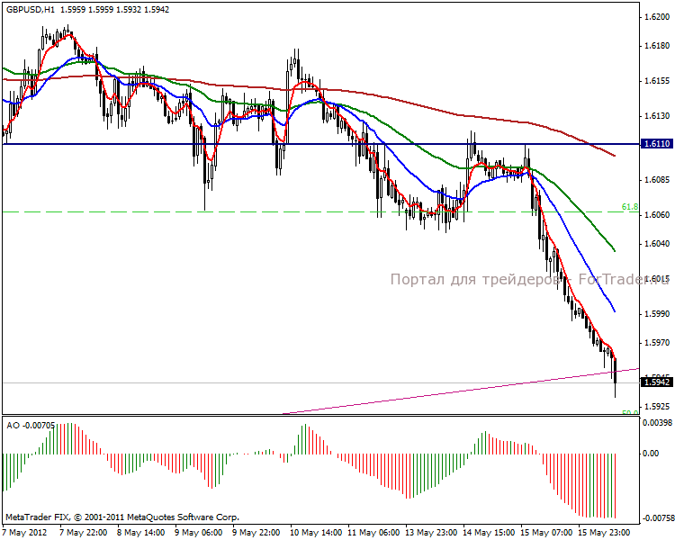 На часовом графике веер МА показывает хорошую перспективу снижения, но в данный момент можем отбиться от нижней границы канала и незначительно скорректироваться к отметке в 1.6033 пункта. После коррекции произойдет продолжение снижения.