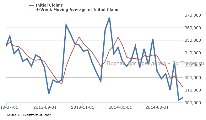 Данные по числу первичных заявок на пособие вышли лучше ожиданий и продолжают оставаться на минимальных уровнях с мая 2007 года. Число первичных заявок на пособие по безработице в США на прошлой неделе выросло лишь на 2 тыс. до 304 тыс., тогда как прогнозировался рост до 315 тыс. Среднее число заявок за последние 4 недели продолжило снижение, упав с 316,75 тыс. до 312 тыс., что стало минимальным значением с октября 2007 года.