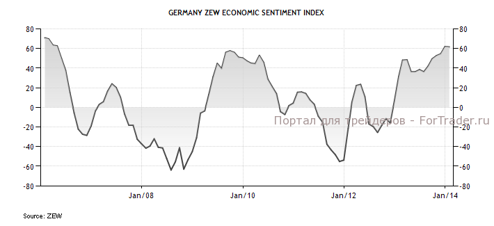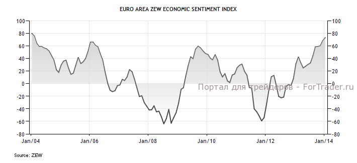 Такой же индекс экономических ожиданий во всей еврозоне от ZEW продолжил рост уже девятый месяц подряд и достиг в январе максимальных значений почти за 10 лет с февраля 2004 года. Индекс вырос до 73,3 п. с 68,3 п. в декабре, превысив ожидания роста до 70,2 п. МВФ повысил прогноз по росту ВВП еврозоны в 2014 году до 1% на фоне усиления экономического роста в Германии и Испании. Представитель ЕЦБ Новотны заявил во вторник, что политика ЕЦБ должна оставаться мягкой, чтобы вернуться к устойчивому экономическому росту. Экономика еврозоны в 2014 году может расти сильнее, чем прогнозировалось, добавил он.