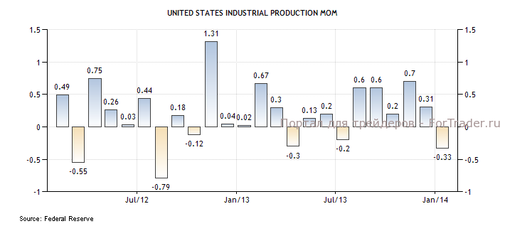 Промпроизводство в США упало в январе на 0,3% по отношению к предыдущему месяцу, против ожиданий роста на 0,2%. Промпроизводство снизилось впервые за 6 месяцев. Производство в обрабатывающей промышленности сократилось на 0,8% м/м. Коэффициент загрузки производственных мощностей уменьшился на 0,4% до 78,5%, продолжая снижаться второй месяц после достижения почти годового максимума.