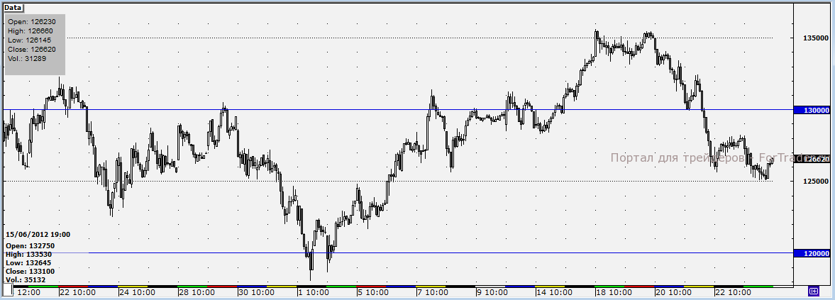 Нисходящий тренд на рынке не очень силен. Пока фьючерсам RIU2 не удается пробить вниз уровень 125 000 пунктов, и в любом движении вниз вскоре происходит отскок. При этом сценарий похода на уровни недавних минимумов (серьезный уровень поддержки в 120 000 пунктов) весьма вероятен. И в случае его пробития дальнейшее снижение может быть сильным.