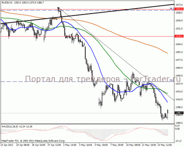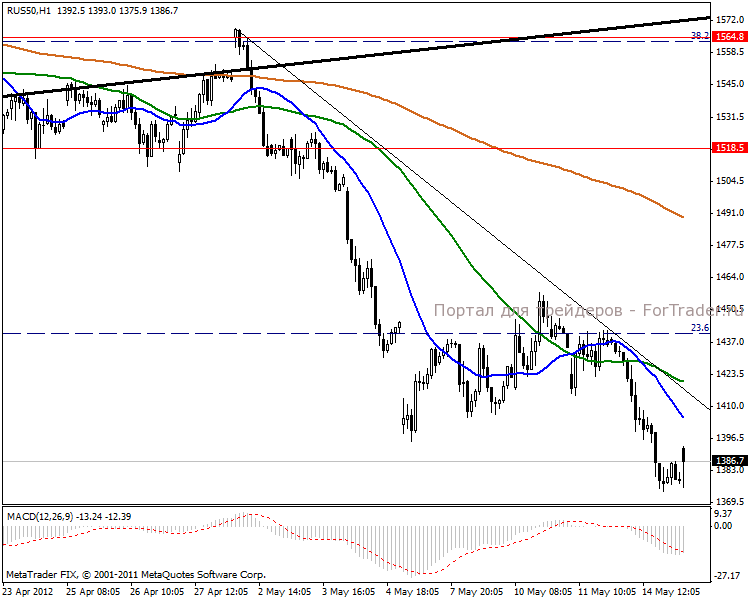 Часовой график продолжает чертить снижение, краткосрочные цели 1399-1385 пунктов взяты. В данный момент назревает коррекция, в случае ее осуществления подойдем к 1407 пунктов, в случае же медвежьей объемной свечи — пойдем сильным снижением к взятию среднесрочных целей.