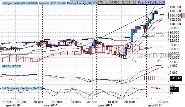 По графическому анализу дневного графика фьючерса: в пользу продолжения покупок выступает комбинации японских свеч «завеса из темных облаков», образованная от 7 и 8 марта, и здесь внимания заслуживает отметка 100.00 – это психологический уровень, и пока фьючерс находится выше него, целью покупок будет 110.00.