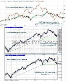 Все рынки связаны между собой и реагируют на движения на смежных рынках. В большинстве случаев все цены движутся в одну сторону. Так, после кризиса в марте 2009 года и фондовые индексы, и товарные цены дружно двинулись вверх к своим докризисным значениям. Естественно, полной и безоговорочной корреляции нет, временами возникают расхождения в движениях. Так, после аварии японский индекс практически стоит на месте, хотя в других странах происходят заметные направленные движения. Российские индексы чаще всего следуют за индексом Доу-Джонса. Правда, на нашем рынке волатильность выше, что приводит к разным амплитудам колебаний цен, но экстремальные значения, то есть развороты на рынках происходят практически одновременно. В этом году корреляция нарушалась в феврале: Доу встал, а индекс РТС рос. Однако в марте минимум на индексах был сформирован практически одновременно, после чего корреляция восстановилась. Но примерно с 20 апреля в движениях индексов снова возникло существенное расхождение: Доу практически остановился, а индекс РТС ушёл в глубокое падение, с 24 мая российский рынок пошёл вверх, а американские индексы двинулись вниз.
