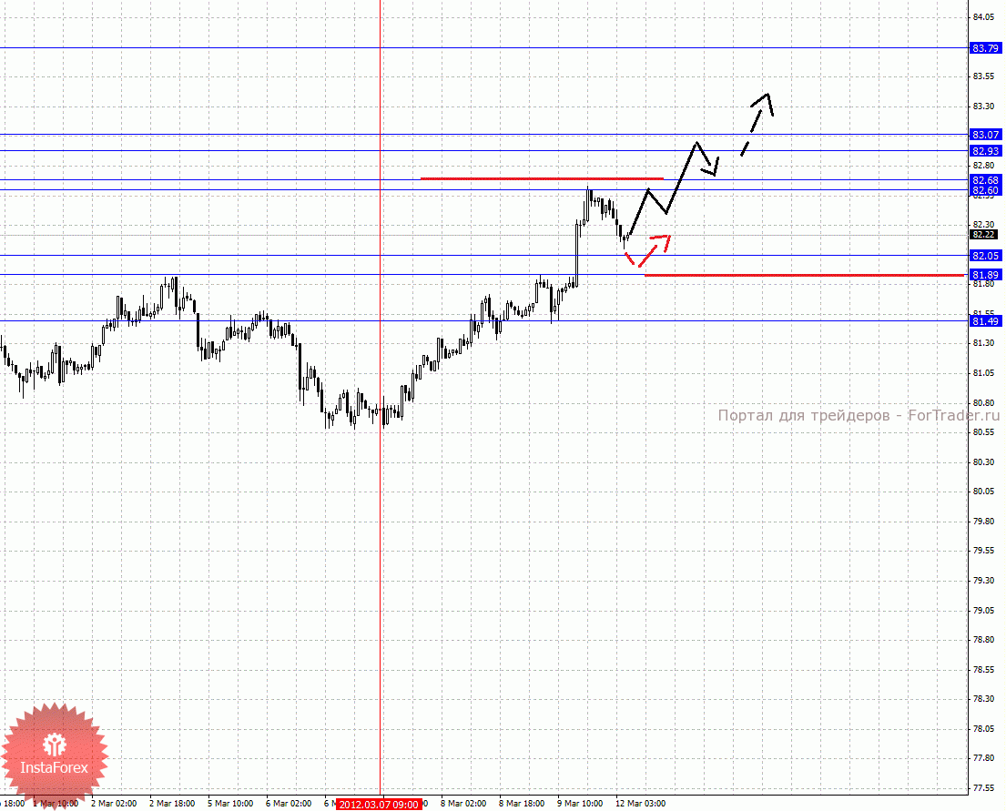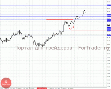 По паре Доллар/Йена ключевыми уровнями являются: 83.79, 83.07, 82.93, 82.68, 82.60, 82.05, 81.89 и 81.49. Здесь продолжения развития восходящей структуры от 7 марта можно ожидать после прохода ценой шумового диапазона 82.60 – 82.68, в данном случае цель 82.93, в коридоре 82.93 – 83.07 консолидация цены. Пробой уровня 83.07 будет сопровождаться неустойчивым движением кверху, здесь потенциальная цель 83.79, однако уровень может быть не достигнут ценой. Краткосрочное нисходящее движение возможно в диапазоне 82.05 – 81.89, пробой последнего значения будет располагать к развитию нисходящей структуры, в данном случае потенциальная цель – 81.49.