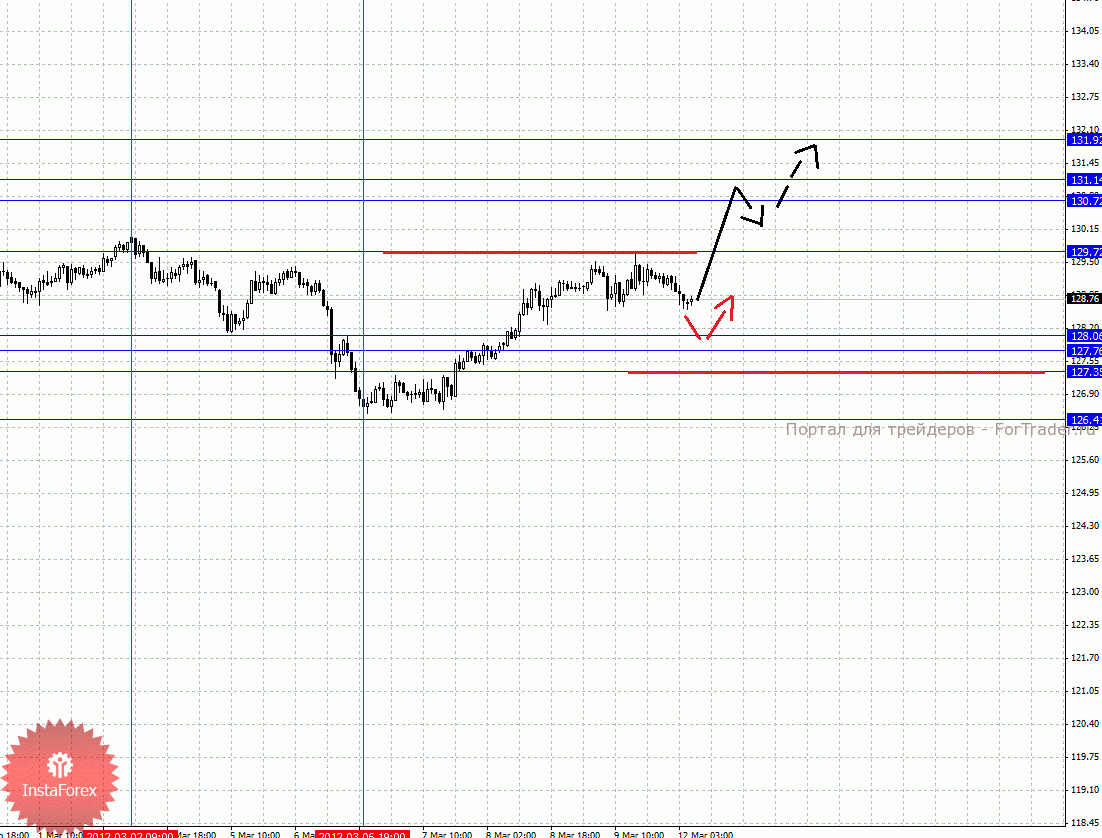 По паре Фунт/Йена ключевыми уровнями являются: 131.92, 131.14, 130.72, 129.72, 128.06, 127.76, 127.35 и 126.41. Здесь продолжения движения кверху ожидаем после пробоя 129.72, в данном случае цель 130.72, в коридоре 130.72 – 131.14 консолидация цены. Потенциальным значением для верха считаем уровень 131.92, по достижении которого ожидаем откат книзу. Корректировочное нисходящее движение возможно в диапазоне 128.06 – 127.76, пробой последнего значения приведет к углубленной коррекции, здесь цель 127.35, от этого уровня высока вероятность разворота кверху, его пробой отменит развитие восходящей структуры от 6 марта, в данном случае цель – 126.41.