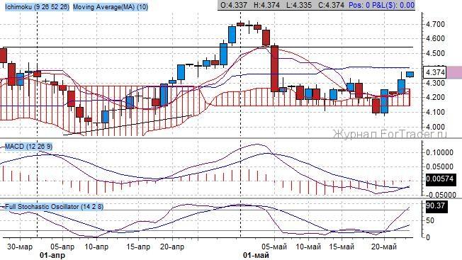 Котировки вышли из облака Ишимоку, целью роста выступает уровень сопротивления на 4.55 – проторгованная область по средним индикатора.