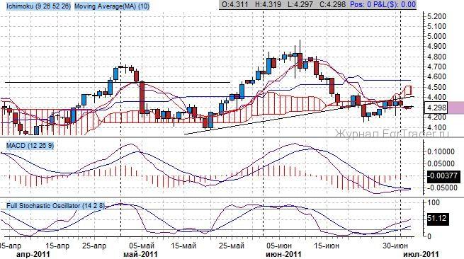 Котировки приблизились к облаку Ишимоку, целью продаж выступал уровень 4.10 – ключевая поддержка. Ключевые скользящие средние составили медвежье пересечение, при этом быстрая скользящая средняя смотрит горизонтально, медленная – горизонтально – признак смены старого и появления нового тренда.