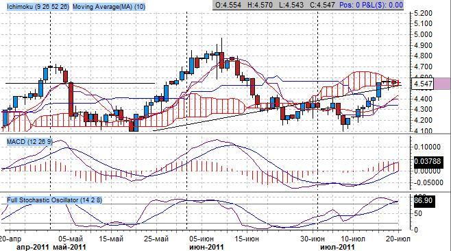 Котировки развернулись наверх после теста уровня 4.10 – ключевая поддержка. Ключевые скользящие средние составили бычье пересечение, при этом быстрая скользящая средняя смотрит повышательно, медленная – повышательно– признак развития повышательного тренда.