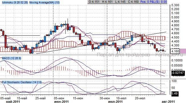 Котировки завершили падение возле уровня поддержки на 4.10 – ключевой уровень. Ключевые скользящие средние составляют бычье пересечение, при этом быстрая скользящая средняя смотрит понижательно, медленная – понижательно – признак глубокой коррекции повышательного тренда.