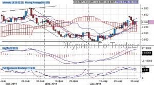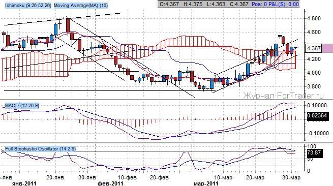 Котировки покинули вновь облако Ишимоку через его верхнюю границу на 4.300 пункта, что демонстрирует силу покупателей. Ранее остановка продаж произошла в диапазоне 3.750-3.800 пункта – сильный уровень поддержки и граница Облака Ишимоку в декабре 2010 года. Важный уровень сопротивления проходит через отметку 4.500 – проторгованный уровень по верхней границе Облака Ишимоку в феврале текущего года. Ключевые скользящие средние находятся в бычьем пересечении с 14 марта, при этом быстрая скользящая средняя торгуется повышательно, а медленная идентично – признак реализации повышательного тренда.