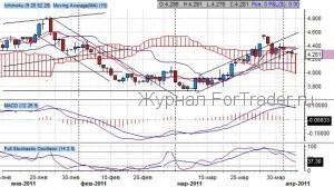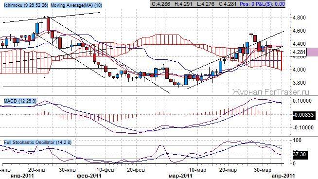 Котировки вновь спустились в облако Ишимоку, пробив в очередной раз верхнюю границу на 4.400 пункта, что демонстрирует силу продавцов. Ранее остановка продаж произошла в диапазоне 3.750-3.800 пункта – сильный уровень поддержки и граница Облака Ишимоку в декабре 2010 года. Важный уровень сопротивления проходит через отметку 4.500 – проторгованный уровень по верхней границе Облака Ишимоку в феврале текущего года. Ключевые скользящие средние находятся в бычьем пересечении с 14 марта, при этом быстрая скользящая средняя торгуется горизонтально, а медленная ей аналогична – признак коррекции повышательного тренда.