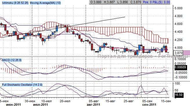 Котировки восстанавливаются к уровню сопротивления на 4.10 – ключевой уровень. Ключевые скользящие средние индикатора Ишимоку составляют бычье пересечение, при этом быстрая скользящая средняя смотрит горизонтально, медленная – горизонтально – признак смены повышательного тренда.