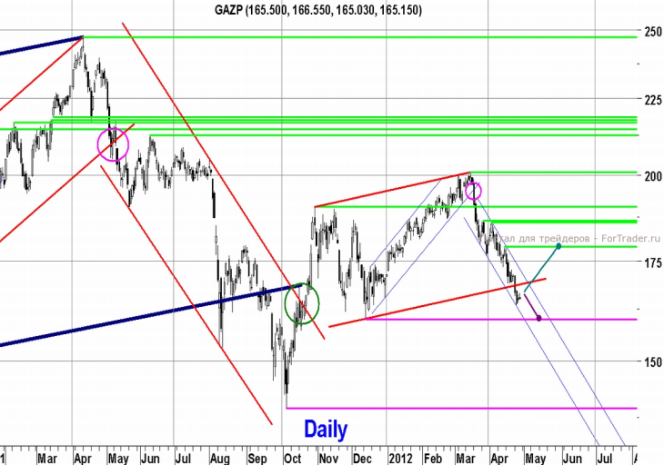 В середине марта, не сумев закрепиться выше психологически важной отметки 200 р., акции Газпрома пробили вниз краткосрочный восходящий канал, в котором они повышались с декабря прошлого года, после чего произошло крутое пике вниз. Сходу была пробита нижняя граница среднесрочного восходящего канала и только в трёх рублях от декабрьских минимумов это стремительное снижение смогло приостановиться.