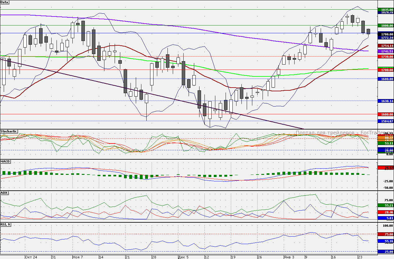 Ближайшие уровни сопротивления: 1800,00/1825,00/1835,00/1850,00