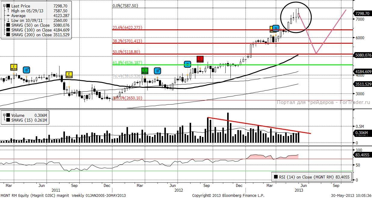 Трейдеры «облюбовали» акции продуктовой компании Магнит. Актив показывает хорошую динамику роста продолжительное время. Для желающих пополнить ряды акционеров лучше повременить с этой мыслью. Фраза «покупай пока дешево» сейчас не подходит. Наилучшим временем, на наш взгляд, является цена 5080 руб. за акцию. По «технике», актив может прийти туда в ближайшие пол года.