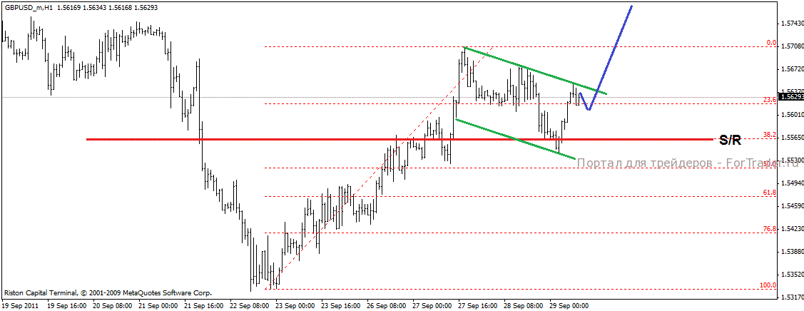 Пара откорректировалась к уровню поддержки проходящему в 38.2% фибо. При этом образовался паттерн продолжение движения флаг. Это указывает на то, что в ближайшее время нас ждет рост пары.