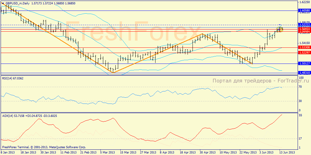 Дневной график: достигнута значительная перекупленность, однако все еще возможно касание уровня 1.5777, куда указывает верхняя полоса Боллинджера.