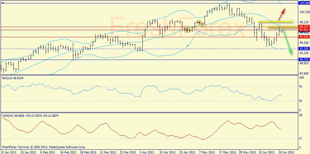 Дневной график: пара достигла средней полосы Боллинджера (98.257) и теперь, по правилам отработки даунтренда, должна двинуться на новые минимумы. Тут же для сбея отметим и критическое сопротивление — это 99.274, выше которого мы получим бычий разворотный паттерн O&U.
