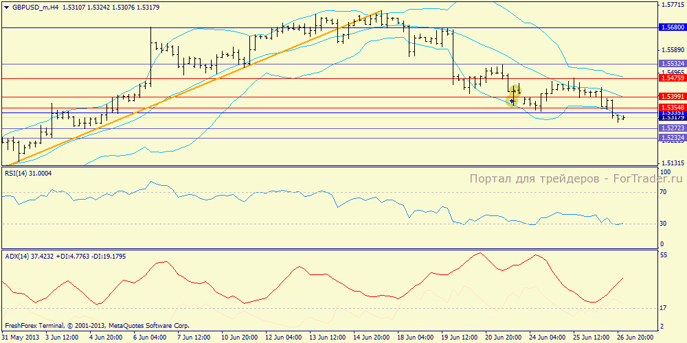 Дневной график: итак, пара достигла обсуждаемой нами отметки 61.8% фибо (1.5290) и теперь, в том случае, если быки готовы взять под свой контроль ситуацию, мы должны увидеть рост с текущих уровней на обновление максимумов (район 1.5820). ADX активируется. Мы видим не лучшее для севера закрытие дня, поэтому можно предположить, что в случае разворота вверх паре понадобится суточная консолидация внутри вчерашнего диапазона (1.5297-1.5338) и, соответственно, формирование дневного ИБ.