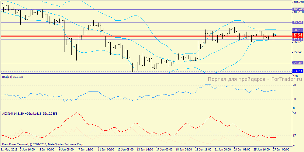 4х-часовой график: пара вошла в боковой диапазон между конвертами Боллинджера (97.215-98.221) и пока не проявляет признаков к выходу из него. ADX неактивен, что так же увеличивает вероятность продолжения вялой торговли.