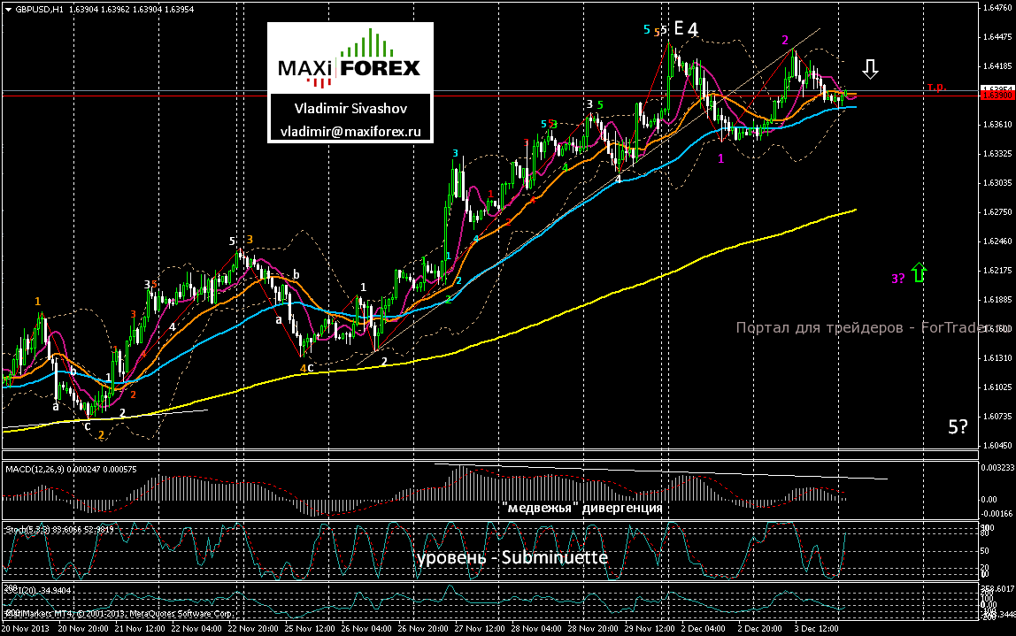 В нашем сегодняшнем прогнозе предполагаем первоначально — боковую торговлю пары в диапазоне 1.6380 ÷ 1.6420. Далее, ожидаем – разворот и снижение курса британской валюты к целевым уровням: 1.6340 и 1.63.
