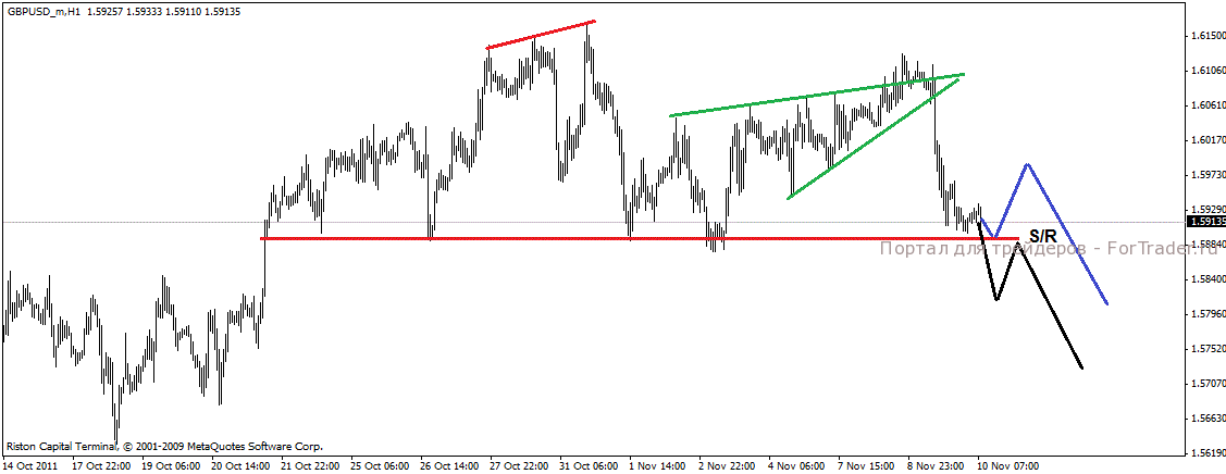 Фунт же в отличии от евро подошел к важному уровню поддержки. Цена несколько раз отбивалась от этого уровня, поэтому нужно быть очень внимательным, не исключено, что и на этот раз произойдет отбой. Если отбой произойдет, то это очевидно приведет к началу коррекционного роста. Если же отбоя не будет, возможен вариант с пробоем уровня поддержки, и обратным возвращением цены для ретеста и возобновление снижения пары.
