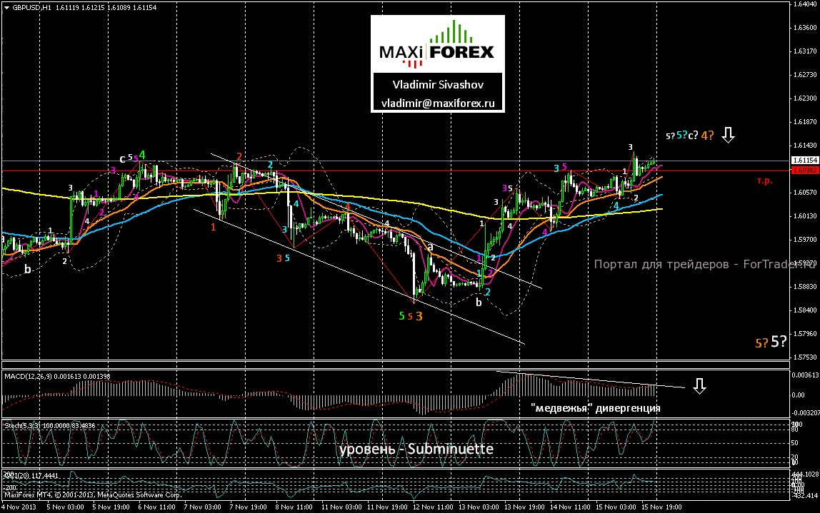В нашем сегодняшнем прогнозе предполагаем подъём курса британской валюты и завершение восходящей коррекции пары в ценовой зоне 1.6140 ÷ 1.6190, а затем разворот и снижение фунта к целевым уровням: 1.61; 1.6056 и 1.6033.