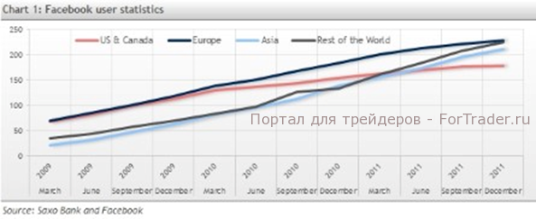 На графике видно, что сетью Facebook пользуются во всем мире, при этом в 2009 и начале 2010 годов число пользователей быстрее всего росло в США, Канаде и Европе. Однако в 2011 году темпы роста в этих регионах снизились, более того, за последние три месяца число пользователей в США и Великобритании сократилось на 280 тыс. и 230 тыс. соответственно. В Северноамериканских странах (США и Канада) и в Европе во втором полугодии 2011 года квартальный рост замедлился до 1,7% и 3,6% соответственно. Несмотря на столь вялую динамику, общий годовой рост клиентской базы в 2011 году в среднем составил 8,6%, в основном за счет Азии и «остального мира».