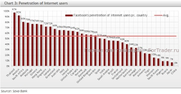 Как показано на графике 3, сети Facebook удалось превратить 55% всего Интернет-сообщества в своих активных пользователей. При этом у Facebook сохраняется большой потенциал на таких рынках, как Индия, Бразилия, Южная Америка, где интернет-инфраструктура еще не так развита, как в Европе и США. Таким образом, расширение присутствия Facebook в этих странах зависит не только от самого Facebook, но и от общего развития их внутренней экономики и интернет-инфраструктуры.