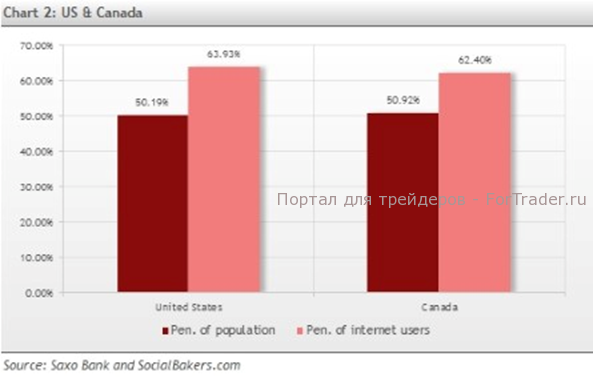 Судя по всему, для Facebook рынки США, Канады и Европы уже полностью сформированы. Так в США и Канаде этой социальной сетью пользуются чуть более 50% всего населения! Интернет в этих странах уже давно стал зрелой технологией, им пользуются более 60% жителей, из которых примерно 80% зарегистрированы в Facebook – впечатляет! (график 2)