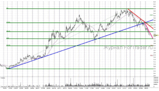 Покупать акции компаний на средний срок, если бы у меня не было бумаг «РусГидро» я бы стала только при пробое этих трендов. На графике «ХолМРСК» это отметка 4 рубля, на графике ФСК «ЕЭС» — 0,35 рубля. Не переживайте — с каждым днем эти тренды тянутся ниже. А пока можно поторговать бумагами спекулятивно, не внутри дня, естественно, а с прицелом неделя-две недели. Можно открыть «лонг», если бумаги «ХолМРСК» поднимутся выше 3,6, а ФСК «ЕЭС» выше 0,32. поддержки 3,2 по бумагам «ХолМРСК» и 0,3 рубля по бумагам ФСК «ЕЭС» выглядят настолько условно, что от них, мне кажется, могут торговать только ловкачи научившиеся покорять часовые тайм-фреймы этих акций.