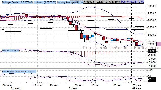 Индикатор Ишимоку отражает наличие среднесрочного понижательного тренда, так как ключевые средние индикатора торгуются синхронно: быстрая – горизонтально, медленная – горизонтально – признак смены тренда. Важный уровень сопротивления расположен на 6100 пунктов, уровень поддержки – на 5200 пунктов.