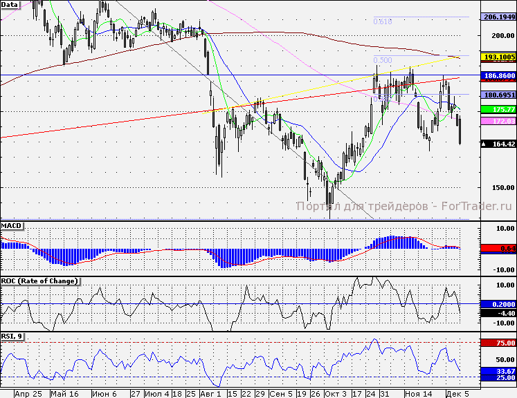 В ходе вчерашней сессии акции эмитента закрыли гэп от 28.11.2011. Следующей целью снижения является ноябрьский минимум – 161,84 руб., который бумаги эмитента в случае ухудшения настроений могут с легкостью переписать. В этом случае в качестве поддержки может выступить психологическая отметка 160 руб., в районе которой часть спекулятивных шортов стоит прикрыть. При улучшении внешнего фона акции эмитента могут скомпенсировать часть вчерашнего снижения. Ближайшим сопротивлением выступает отметка 167 руб.