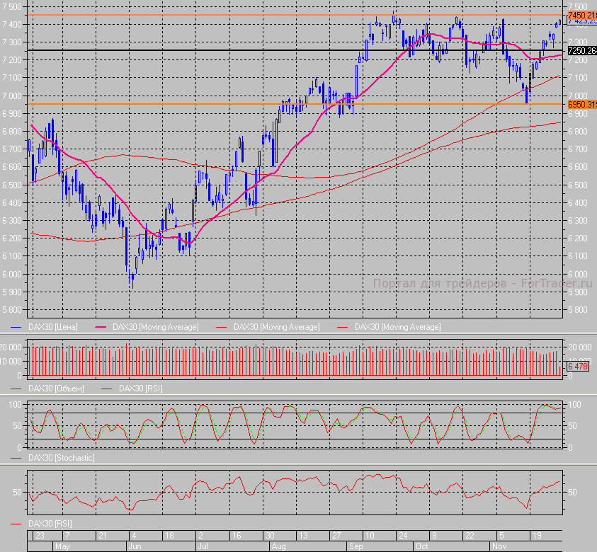 Котировки индекса DAX постепенно карабкаются вверх на этой неделе и с 7000 пунктов они уже выросли к пятнице до 7400 пунктов. Сегодня утром индекс открылся на уровне 7410 и в течение дня неоднократно пытается утвердиться на 7430 пунктах. По дневному графику видно, что следующим сильным сопротивлением для индекса будет 7450 пунктов.