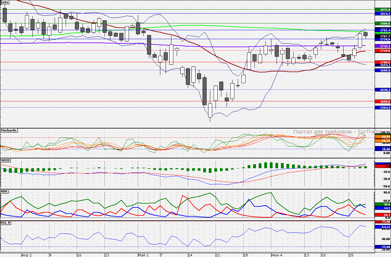 Ближайшие уровни сопротивления: 1780,00/1800,00