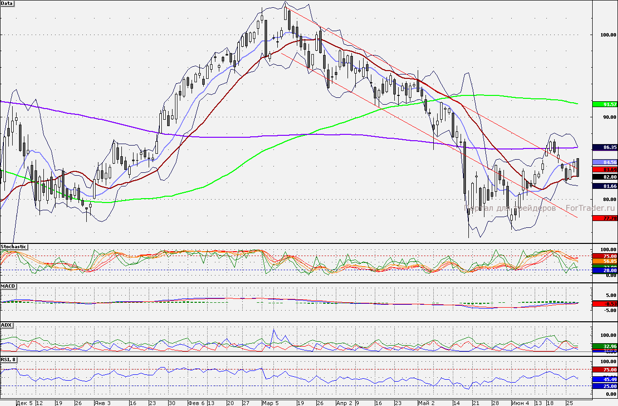 Акции Сбербанка закрылись на 21-дневной скользящей средней, с учетом позитивного внешнего фона акции могут вернуться к 10-дневной скользящей средней – 84,56 руб. Следующей важной отметкой является 200-дневная скользящая средняя – 86,27 руб. Поддержкой является 21-дневная скользящая средняя – 82,75 руб.