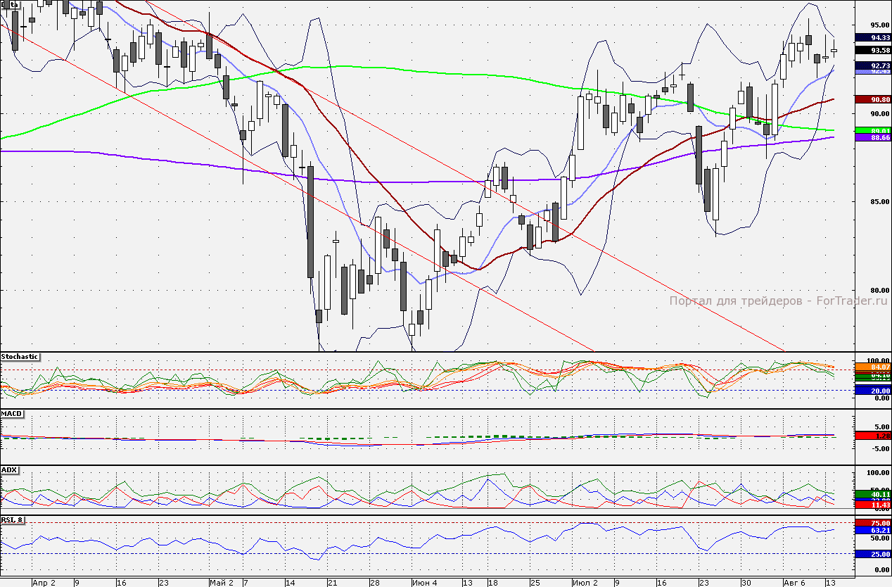 Акции Сбербанка продолжают торговаться вблизи 95 руб. От данного уровня «лонги» по-прежнему стоит сокращать. Поддержкой является 10-дневная скользящая средняя – 92,45 руб. От данной отметки спекулятивные «лонги» стоит наращивать.