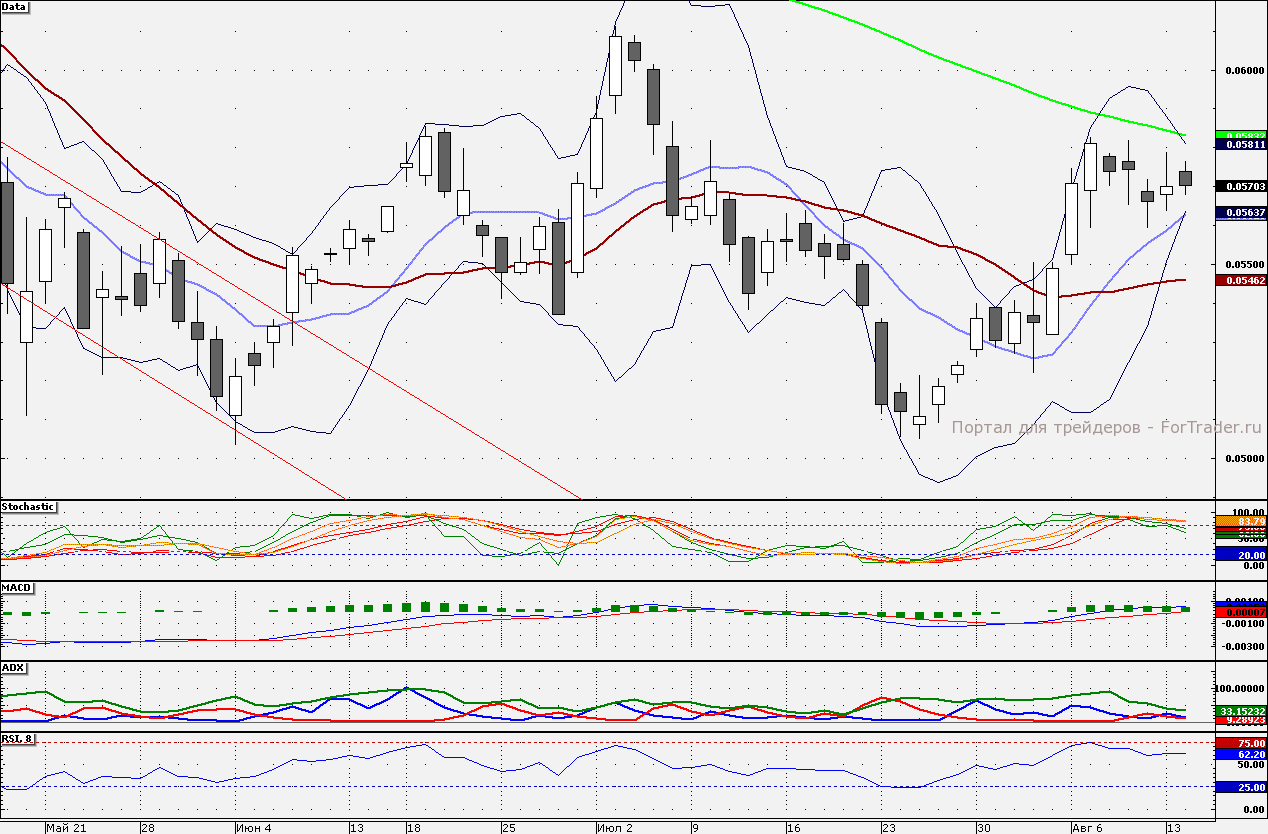 Акции ВТБ по-прежнему зажаты в районе 5,6-5,8 коп. От верхней границы «лонги» стоит сокращать, причем отметка 5,8 коп. усилена 100-дневной скользящей средней – 5,832 коп. Поддержка 5,6 коп. усилена 10-дневной скользящей (5,628 коп.), от которой «лонги»спекулятивно стоит наращивать.