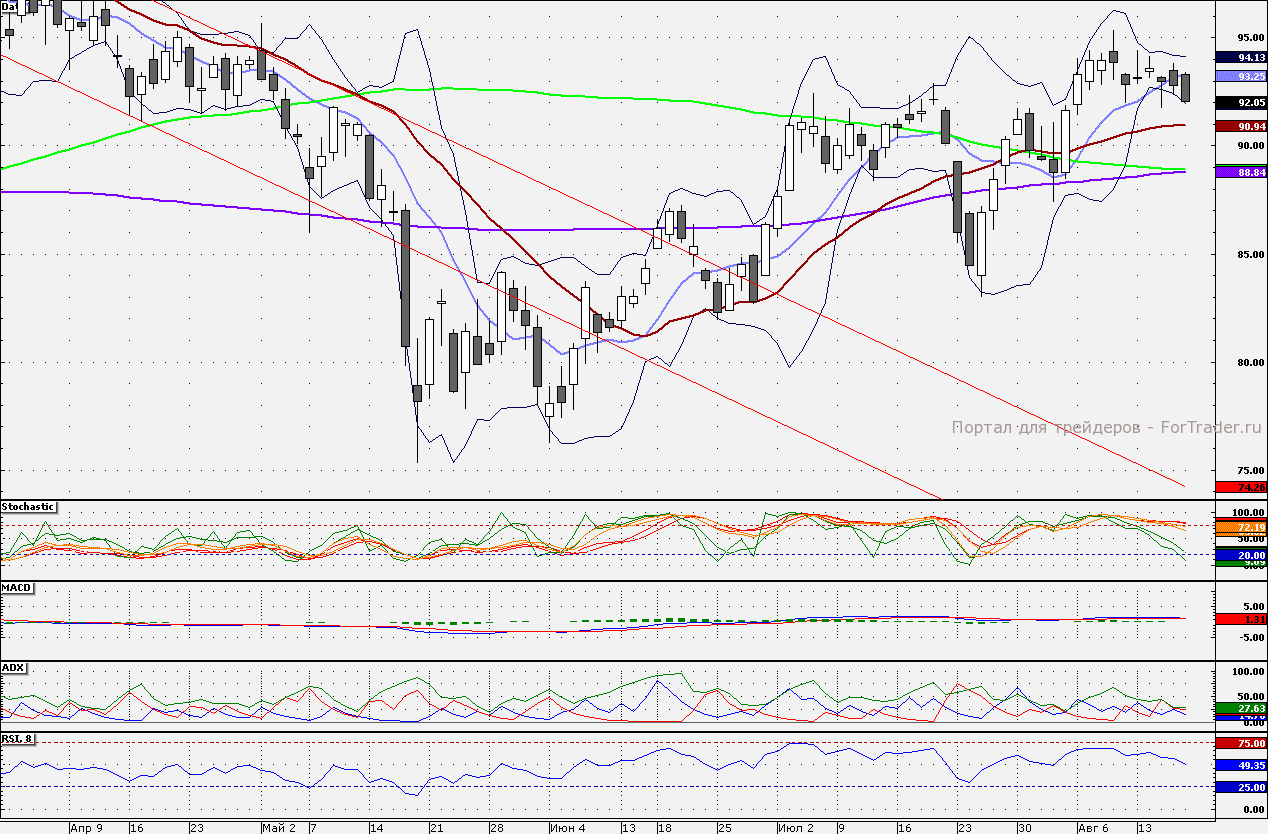 Акции Сбербанка торгуются вблизи 92 руб. Пока данная отметка удерживается «лонги» стоит наращивать, но устанавливать стопы. Далее поддержкой станет 21-дневная скользящая средняя – около 91 руб. Сопротивлением является 10-дневная скользящая средняя – около 93 руб.