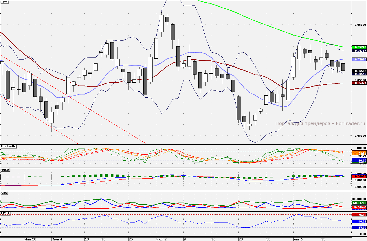 Акции ВТБ торгуются в районе 5,6 коп. Далее поддержкой станет 5,5 коп., где проходит 21-дневная скользящая средняя. Сопротивлением является 10-дневная скользящая средняя 5,7 коп.
