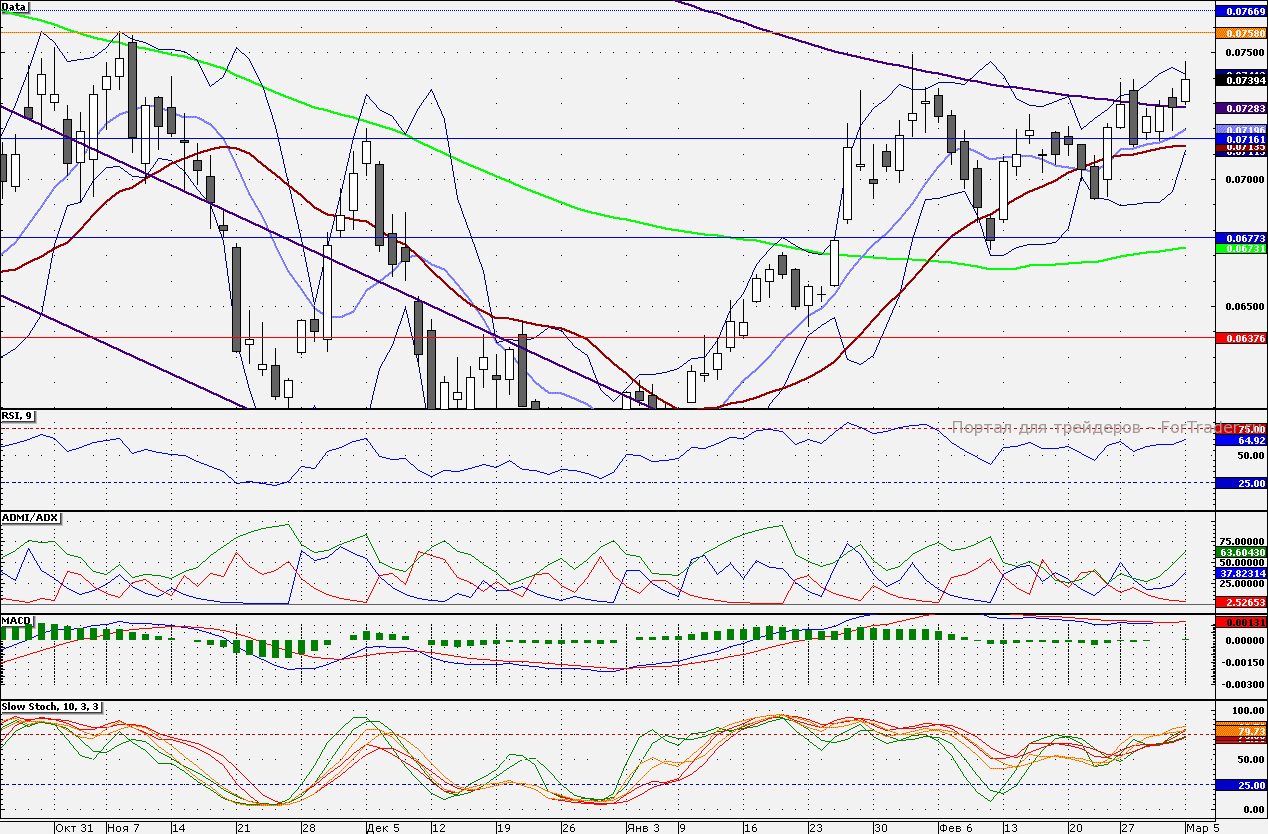 Акции банка протестировали 7,500 коп., но не закрылись выше данной отметки. Сегодня от данного уровня «лонги» стоит сокращать, наращивать лишь при пробитии. Поддержкой является 200- дневная скользящая средняя – 7,283 коп.
