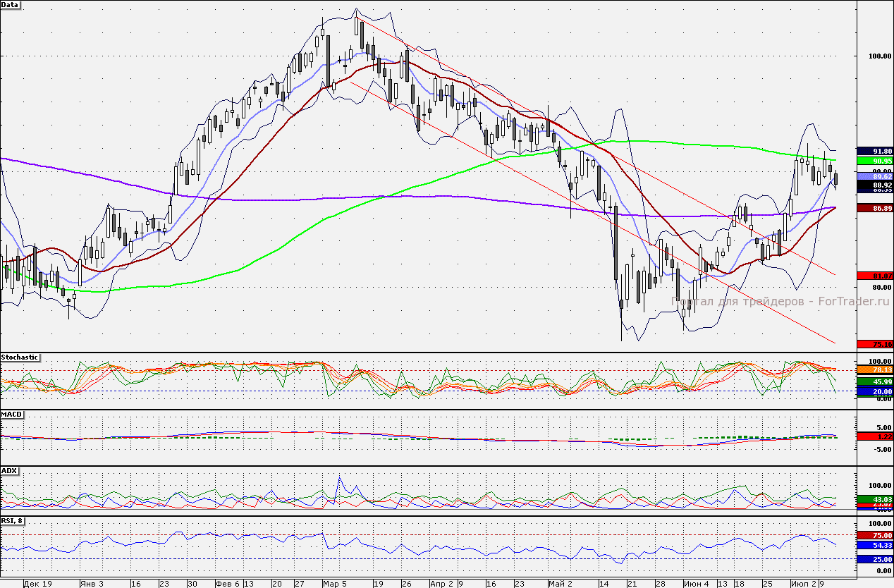Акции Сбербанка накануне упали вниз от сопротивления 90,00 руб. Но сегодня «быки» могут вновь увести акции к данному сопротивлению. От данной отметки «лонги» стоит частично сократить, более активно к распродажам стоит приступать от 100-дневной скользящей – 90,95 руб. При ее преодолении длинные позиции стоит вновь открывать.