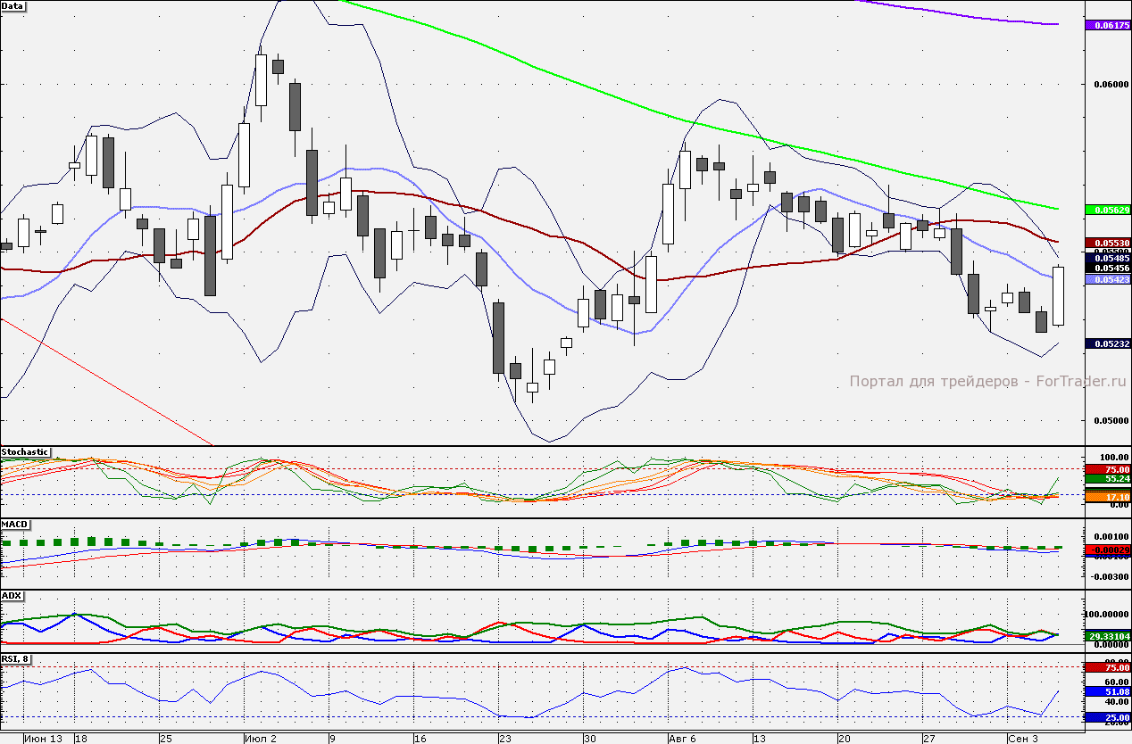 Сопротивлением является 21-дневная скользящая средняя – 5,517 коп. Данную отметку акции могут протестировать сегодня, но до ее пробития открывать «лонги» не стоит. При удачном сценарии акции могут протестировать 100-дневную скользящую среднюю – 5,619 коп., от которой длинные позиции стоит сокращать. Поддержкой является 10-дневная скользящая средняя – 5,413 коп.
