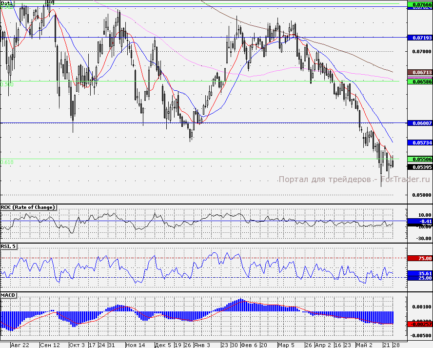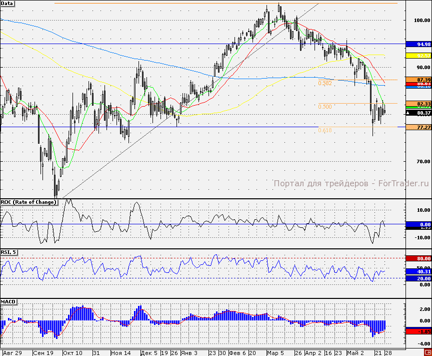 Кардинально картина в акциях Сбербанка за вчерашнюю сессию не изменилась: 10-дневная скользящая вновь придержала бумаги от дальнейшего роста, а закрытие состоялось вблизи уровня 80 руб. Не исключено, что сегодня некоторую поддержку акциям эмитента может оказать ожидание публикации отчетности по МСФО, которая намечена на завтра. Ближайшим сопротивлением по акциям выступает район 81,90 руб., вблизи которого я бы рекомендовала фиксировать прибыль по спекулятивным лонгам. В качестве ближайшей поддержки выступает уровень 78 руб.