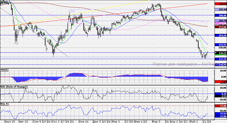 В ходе вчерашней сессии акции эмитента протестировали значимый уровень сопротивления 145 руб., однако закрепиться выше бумагам не удалось. Не исключено, что акции в ходе сегодняшней сессии вновь попытаются протестировать данную отметку, закрепление выше которой открыло бы дорогу на 150 руб. В случае формирования негативных настроений акции эмитента могут не удержать ближайшую поддержку в виде 10-дневной скользящей средней (143 руб.). Тогда следующая поддержка будет располагаться на уровне 140 руб.