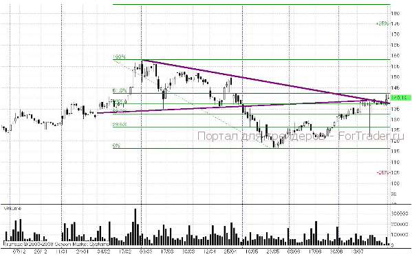 От своего локального майского дна акции проделали хороший путь наверх и, не скрою, было несколько упущенных сигналов на покупку. Но зато, за это время утвердился красивый восходящий тренд, подтягивающийся в район 125-130 рублей, а также предпринята попытка пробить нисходящий тренд марта 2011 года (138 рублей). Теперь на пути бумаги к годовым «хаям» стоит лишь рубеж 143 рубля (линия коррекции по Фибоначчи 61,8%). На её пробое я думаю о покупке бумаг, ведь годовые пики — это одна из целей, примерно за полгода бумаги могут и обновить их, сходив к отметке 161,8 по Фибо (район 200 рублей).