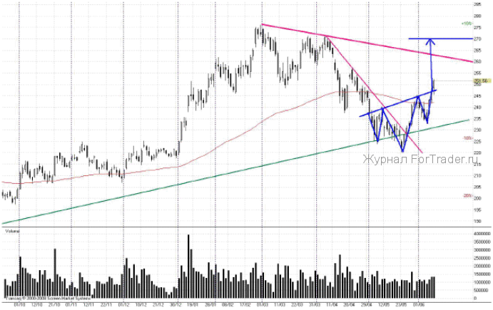 Уточню, тем не менее, пока полную реализацию фигуры не жду в район 270 рублей, но до отметки 260 рублей бумаги должны достаточно живо дотянуть (нисходящий тренд от февраля 2011 года). Соответственно из позиции по акциям буду выходить частями.