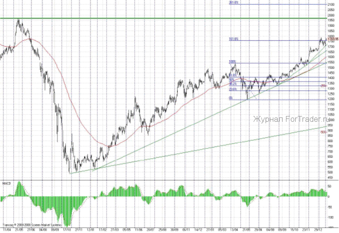 Если посмотреть на индекс ММВБ, то, несмотря на вчерашнее снижение – он ведет себя достаточно бодро. Пока не может индикатор взять рубеж 1750 пунктов, но даже если он опустится к поддержке 1710 пунктов, его котировки останутся в рамках восходящего тренда от ноября 2010 года. Ниже на уровне 1650 пунктов пролегает сентябрьский восходящий тренд 2010 года, еще ниже 1550 — восходящий тренд от января 2009 года. Заметили? Ключевое слово тут «восходящий»! так, что тем, кто держит позиции на средний срок особо волноваться не о чем.