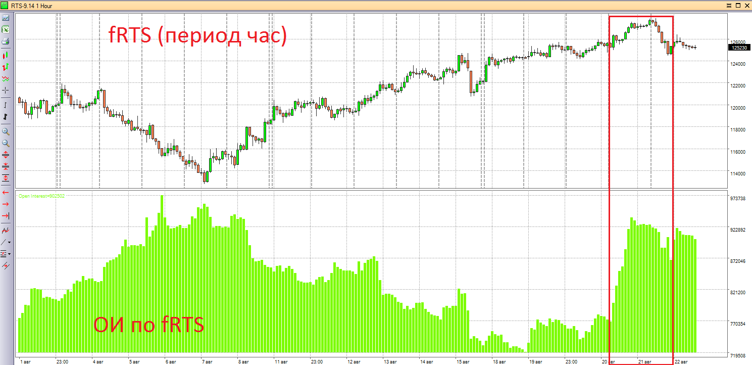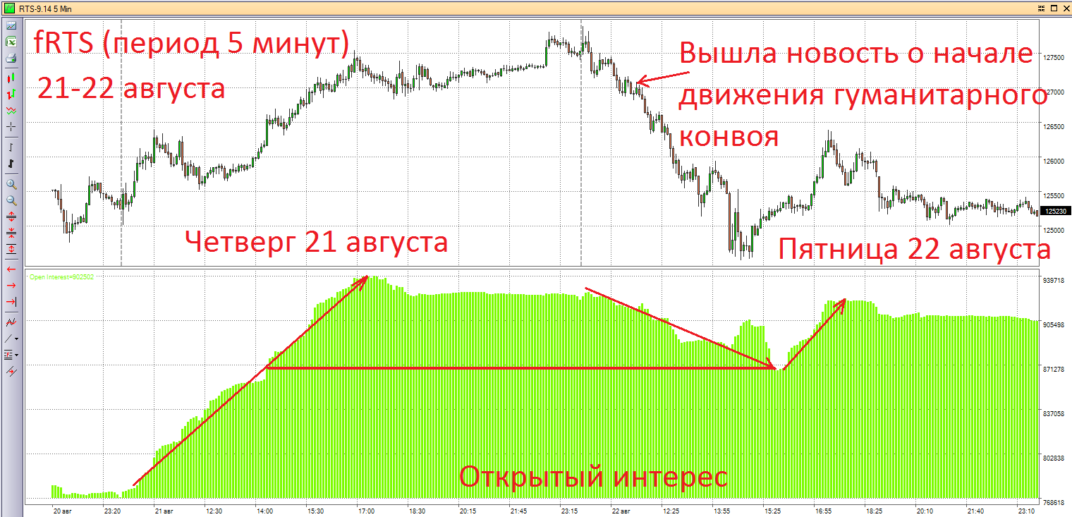 В четверг вечером я отметил, что если мы увидим снижение Открытого Интереса (ОИ) по фьючерсу на индекс РТС при снижении рынка, то это подтвердит мой расклад, значит, «умные» деньги действительно открывали направленную позицию вниз и теперь её закрывают и фиксируют прибыль и минимизируют риски. В пятницу мой взгляд подтвердился. Кто-то заранее знал о новости, которая привела в пятницу к падению рынка, и соответственно, заработал на ней. Не надо думать, что пятничная новость о начале движении гуманитарного конвоя была спонтанной, долгие переговоры шли уже много дней, подобное решение зрело уже давно, и кто-то об этом явно знал.